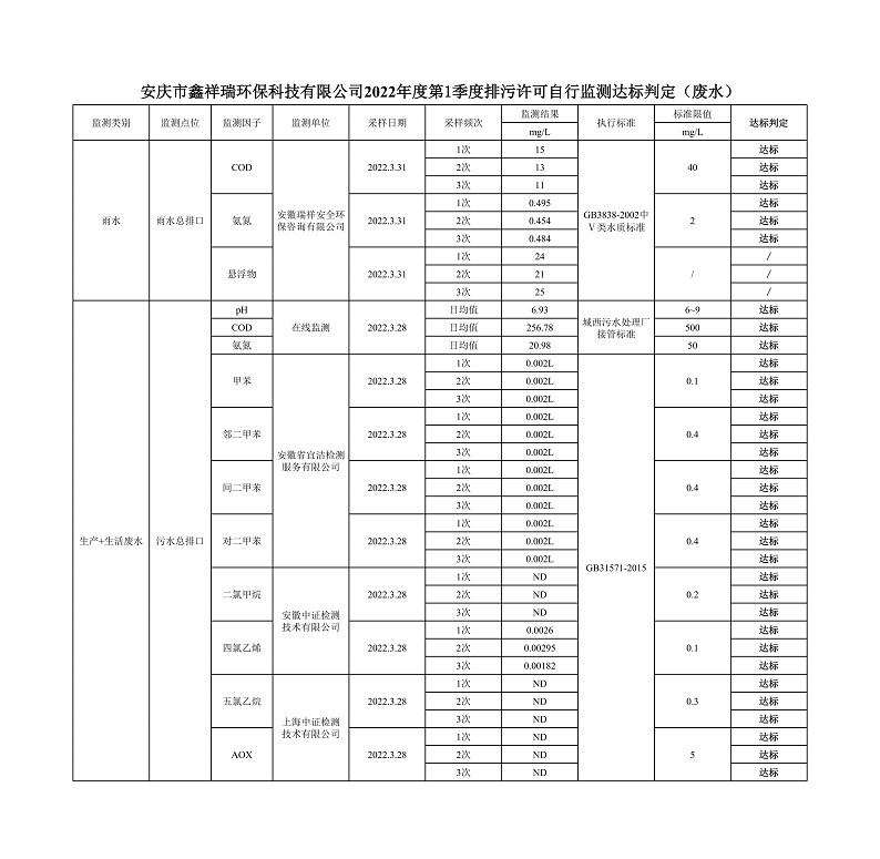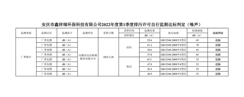 安慶市鑫祥瑞環(huán)??萍加邢薰?022年第1季度排污許可自行監(jiān)測(cè)公示